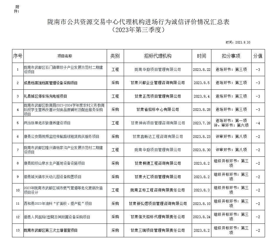 根據(jù)《甘肅省公共資源交易代理機(jī)構(gòu)管理辦法》(甘政辦發(fā)〔2019〕107號(hào))和《隴南市公共資源交易中心代理機(jī)構(gòu)進(jìn)場(chǎng)行為誠(chéng)信評(píng)價(jià)實(shí)施制度(試行)》規(guī)定,現(xiàn)對(duì)2023年第三季度,共 12 家代理機(jī)構(gòu) 13 條進(jìn)場(chǎng)行為誠(chéng)信評(píng)價(jià)記錄予以通報(bào)(詳見附表)。請(qǐng)各代理機(jī)構(gòu)嚴(yán)格遵守各項(xiàng)規(guī)章制度、誠(chéng)實(shí)守信,規(guī)范操作,為招標(biāo)人和采購(gòu)人提供專業(yè)、高效、規(guī)范的招標(biāo)代理服務(wù)。