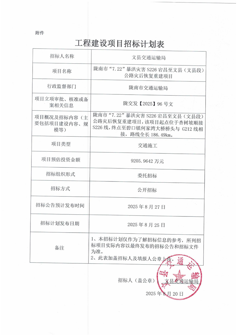 隴南市“7.22”暴洪災害S226宕昌至文縣(文縣段)公路災后恢復重建項目