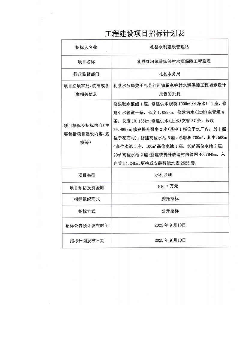 禮縣紅河鎮(zhèn)霍家等村水源保障工程監(jiān)理
