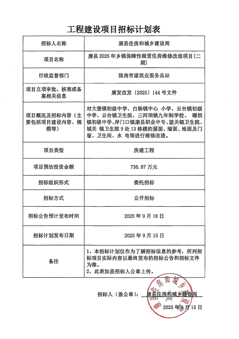 康縣2025年鄉(xiāng)鎮(zhèn)保障性租賃住房維修改造項(xiàng)目(二期)