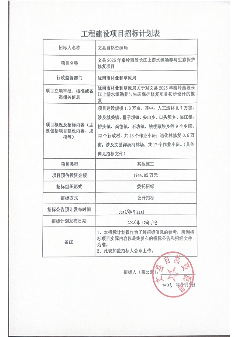 文縣2025年秦嶺西段長江上游水源涵養(yǎng)與生態(tài)保護修復(fù)項目