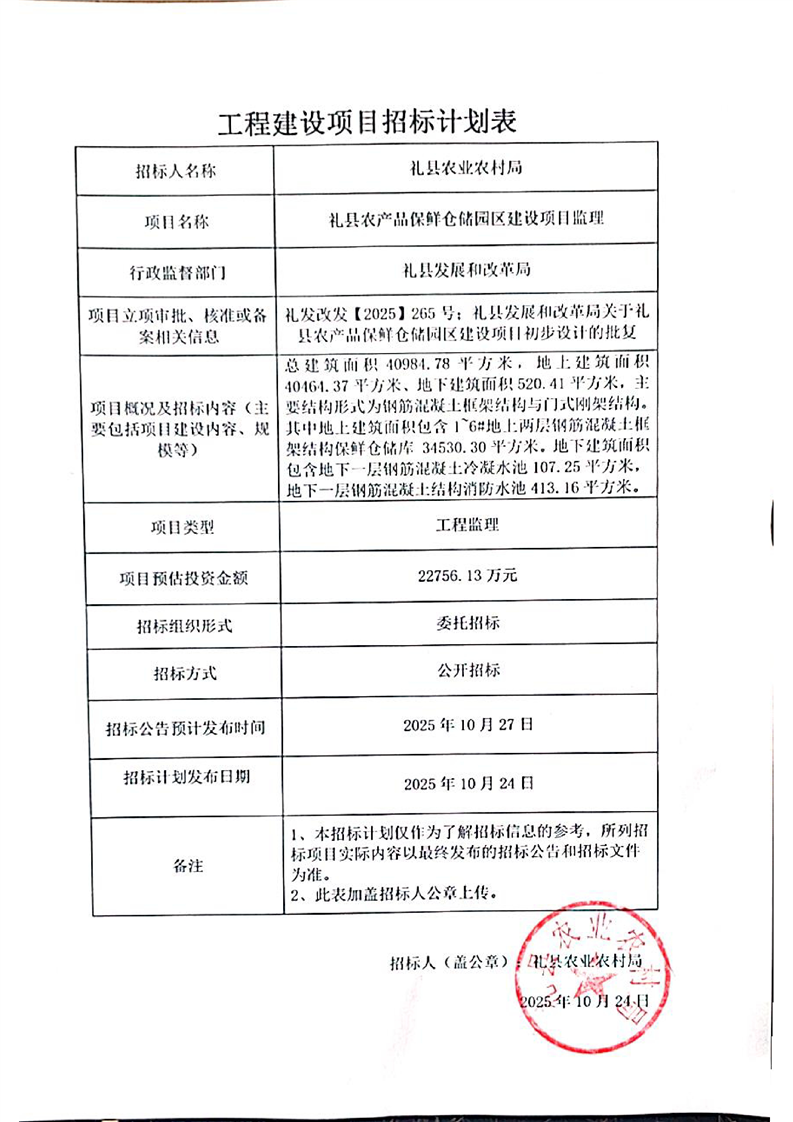 禮縣農產品保鮮倉儲園區(qū)建設項目監(jiān)理