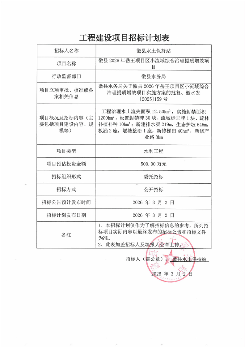 徽縣2026年岳王項(xiàng)目區(qū)小流域綜合治理提質(zhì)增效項(xiàng)目