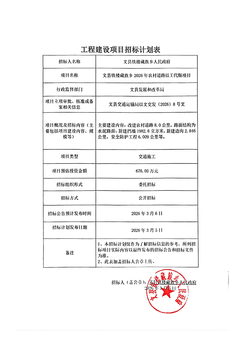 文縣鐵樓藏族鄉(xiāng)2026年農(nóng)村道路以工代賑項目